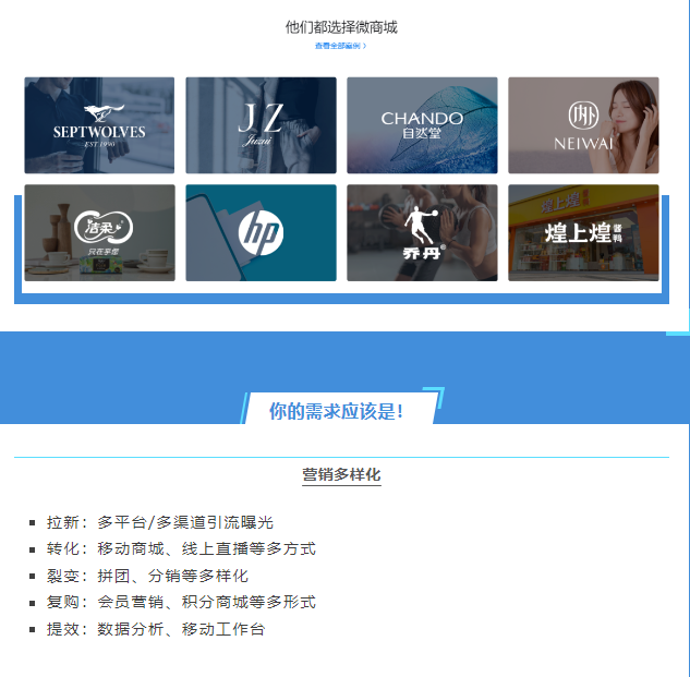 微盟微商城是全渠道(dào腦湖)小程序電商解決方案,商家可利用統一後(hòu)台開(kā到刀i)通、管理和經(jīng)營微信、QQ快呢、支付寶、百度、小紅書等渠道(dà有劇o)店鋪,實現流量沉澱、轉化變現、粘性強化和裂變增長(cháng這白)的全流程,以私域長(cháng)期經(jīng)營帶動品話動牌持續增長(cháng)。